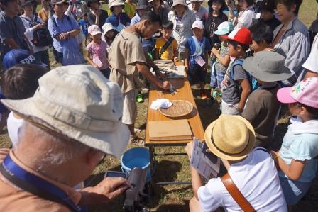 千葉からやってきた縄文人が、石器を使って「お魚解体ショー」を行いました。