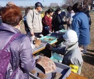 発掘地点2ヵ所の見学と、今回の発掘調査で見つかったばかりの土器片の展示もありました。