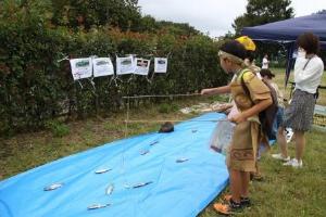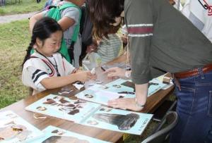 弓や石のペンダント(勾玉)作りなど指定したブースで縄文の技に挑戦した人には、下野谷遺跡メダル(シール)をプレゼント!会場にはメダルを首からさげ嬉しそうな子どもたちをたくさん見ることができました。