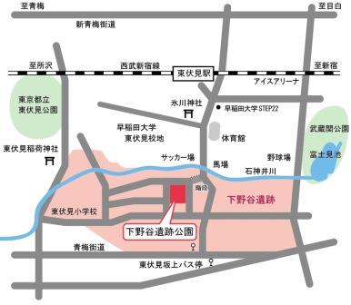 下野谷遺跡公園(西東京市東伏見六丁目4番)として整備され、地下には遺跡が保護されています。地図は