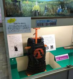 注目ポイントは胴にある丸八マークです。丸八マークは尾張藩の合印です。江戸時代、保谷地域は尾張徳川家の鷹狩りの場でした。この鎧は尾張藩が合戦の際に貸し出した「御貸具足」と考えられ、尾張徳川家との関係が伺える資料となっています。