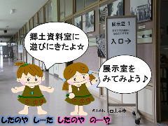 1階中央玄関を入り、階段を上がると2階右側が郷土資料室です。5つの展示室があります。