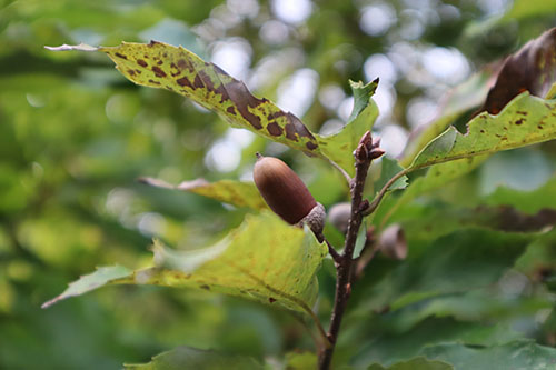 公園内を歩いていると、夕陽に照らされたどんぐりが実をつけていました。