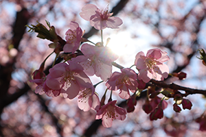 冷たい風を和らげる暖かな日差しが降り注ぐ中、カワヅザクラがいこいの森公園を彩っていました。