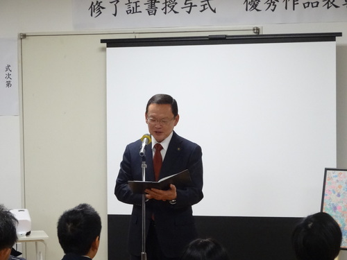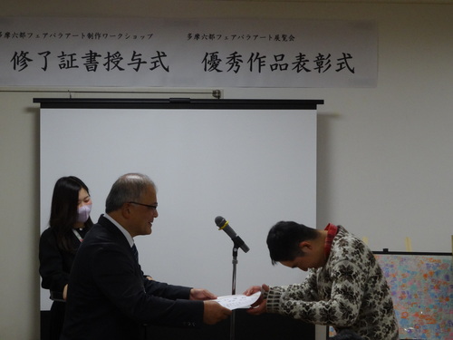 事業の最後にはワークショップに参加していただいた受講生への修了証書の授与式と、展覧会に出展した作品の中から選出された優秀作品の表彰式を開催し、市長及び多摩北部都市広域行政圏協議会事務局次長より授与しました。