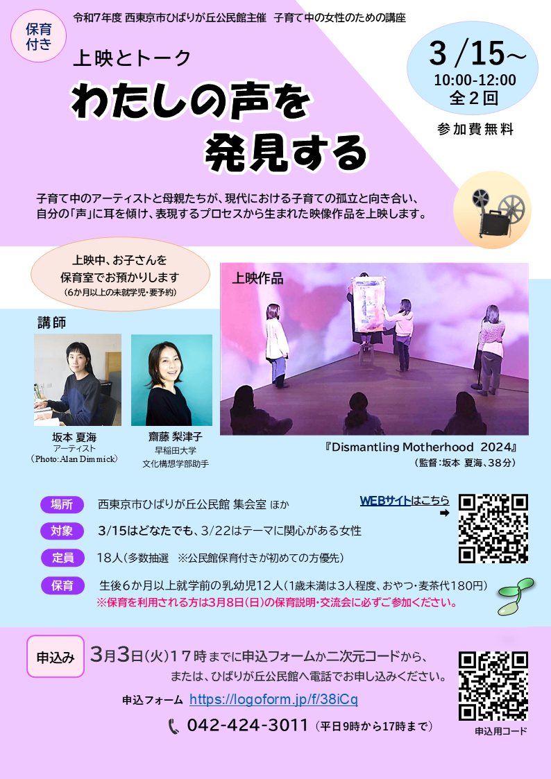 3月3日(火曜日)午後5時までに、申込フォーム(URL・二次元コード)、または電話でひばりが丘公民館へ