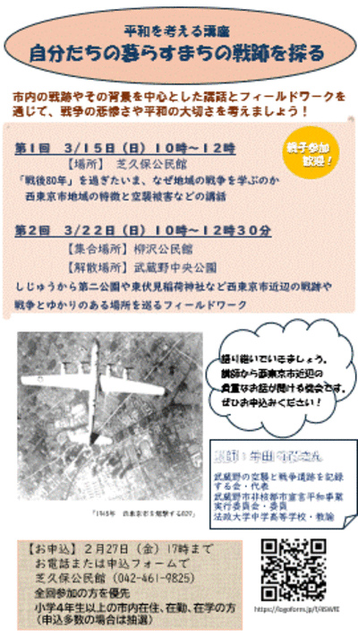 | 第1回 | 3月15日(日曜日)午前10時から正午 | 芝久保公民館 | 「戦後80年」を過ぎたいま、なぜ地域の戦争を学ぶのか?、西東京市地域の特徴と空襲被害などの講話 |