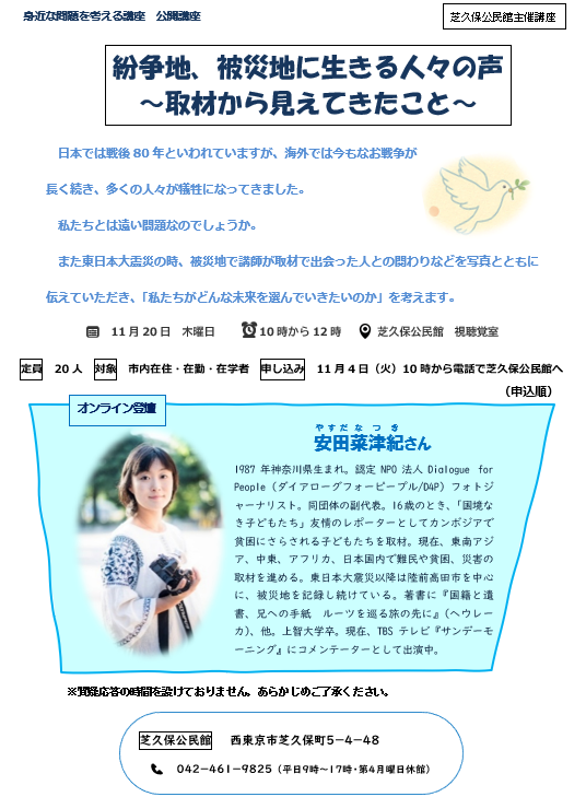 11月4日(火曜日)午前10時から電話で芝久保公民館へ(平日午前9時から午後5時まで)