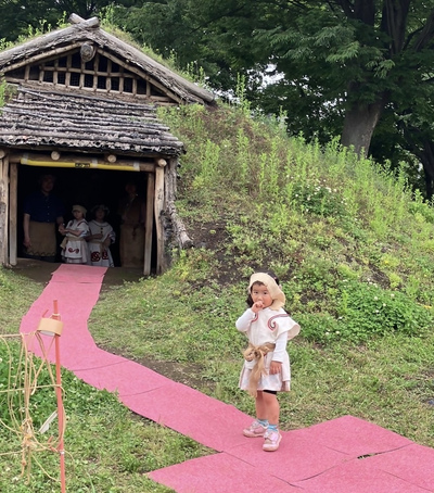 縄文人になりきって竪穴住居の前でポーズする縄文ファッションショーと、下野谷遺跡史跡指定10周年のお祝いとして記念ポストカードを来場者の皆様にお渡ししました。