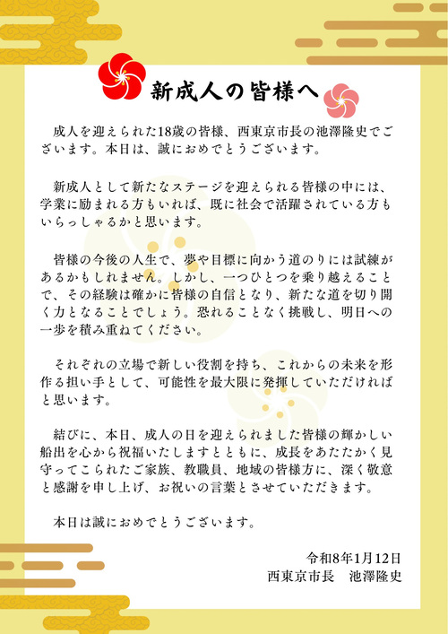 成人を迎えられた18歳の皆様へ、市長より、お祝いのメッセージです。