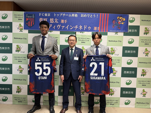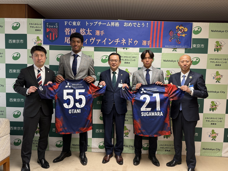 令和8年2月24日(火曜日)に西東京市出身で東京フットボールクラブ株式会社(FC東京)所属の菅原悠太選手、尾谷ディヴァインチネドゥ選手が今季からトップチームに昇格したことを報告するため、市長を表敬訪問されました!