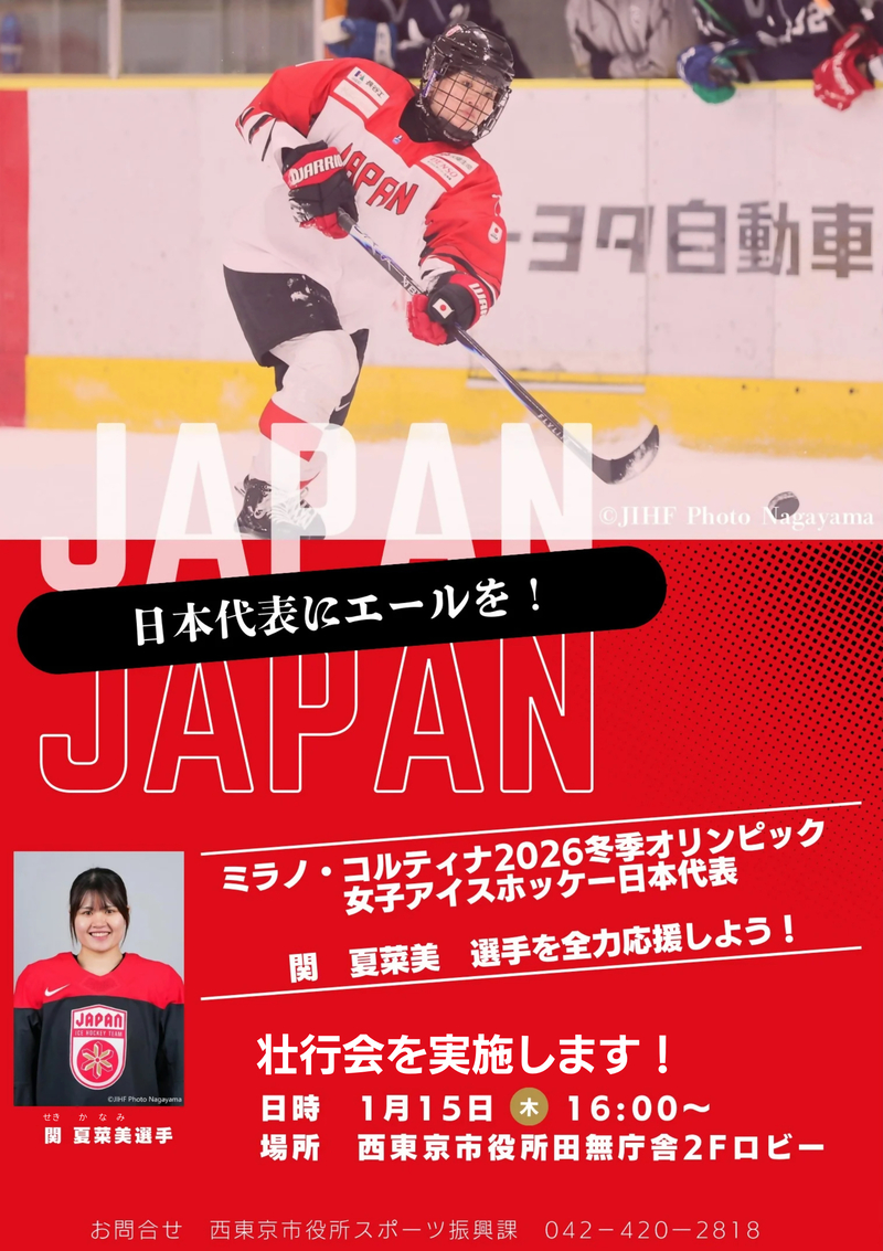 ミラノ・コルティナ2026冬季オリンピックの女子アイスホッケー競技に出場する西東京市民の関 夏菜美(せき かなみ)選手に来庁いただき、壮行会を実施します!