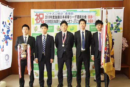 祝!優勝!シチズン時計卓球部の皆さんが丸山市長に大会報告を行いました