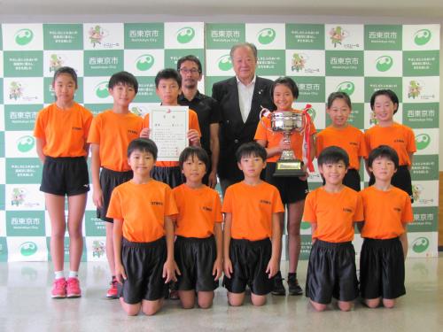 薫スターズ(バレーボール)の選手の皆さんが丸山市長に競技結果を報告しました。第39回全日本バレーボール小学生大会東京都大会に出場し男女混合の部で優勝しました。
