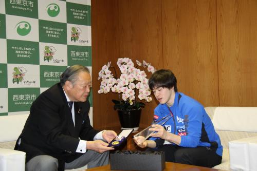 令和2年1月13日から19日の間に行われた、天皇杯・皇后杯全日本卓球選手権大会において森薗選手(BOBSON)が伊藤美誠選手(スターツ)とペアを組み、混合ダブルスで優勝したことについて、市長に報告しました。