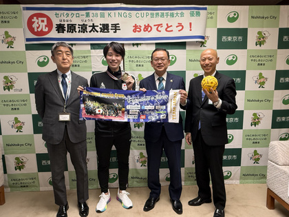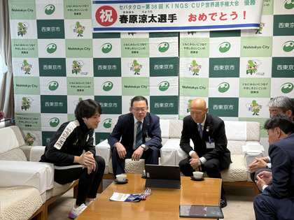 令和7年11月17日(月曜日)に西東京市ゆかりのセパタクローで活躍されている春原涼太(はるはらりょうた)選手が世界大会優勝報告のため、市長訪問にいらっしゃいました!