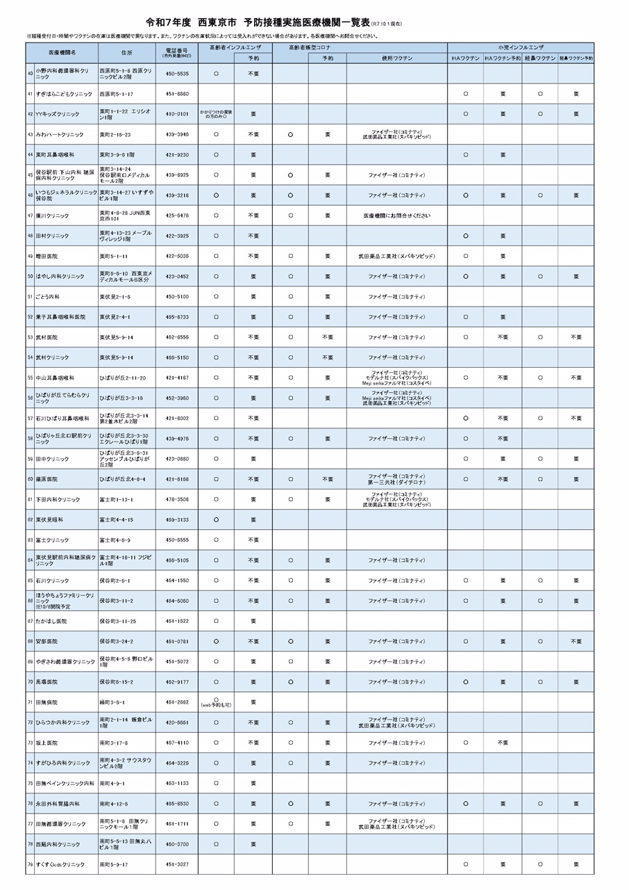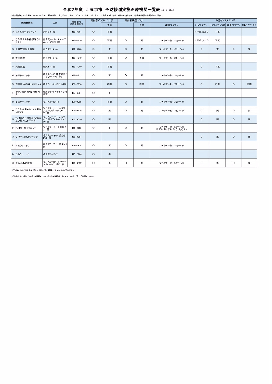 高齢者のインフルエンザ予防接種(季節性)、高齢者新型コロナワクチン予防接種、小児インフルエンザ任意予防接種の市内実施医療機関一覧です。(令和7年10月1日現在)医療機関一覧(PDF:259KB)