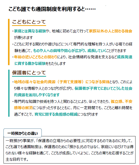 全ての子どもの育ちを応援し、子どもの良質な成育環境を整備するとともに、全ての子育て家庭に対して、多様な働き方やライフスタイルにかかわらない形での支援を強化し、月一定時間までの利用可能枠の中で、就労要件を問わず時間単位等で柔軟に利用することができる制度です。
