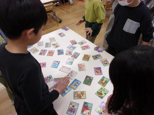 「ふとんがふっとんだ」「でんわにでんわ」など思わず笑ってしまうダジャレがいっぱいのかるたでしたが、子ども達の表情は、みんな真剣。