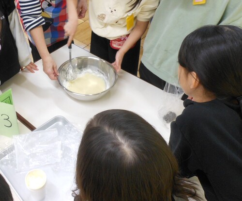 材料をボウルにいれて混ぜ合わせるだけの簡単クッキングで、オーブンで焼く作業は職員が行いました。