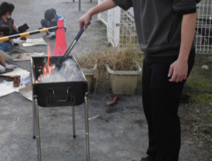 バーベキューコンロの中で燃える火に杉板を入れて表面を焦がします。