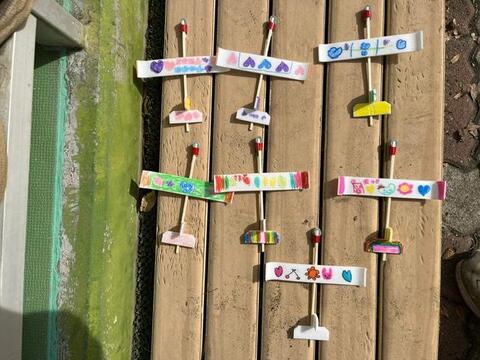 また食品トレイ飛行機に自分で色塗りをして園庭で飛ばして楽しんでいました。