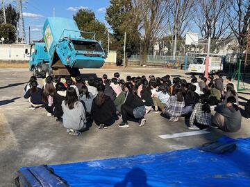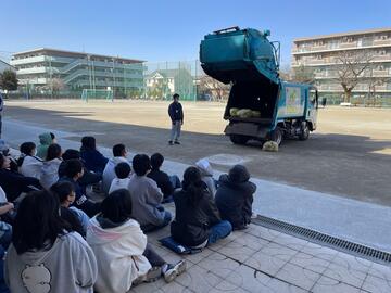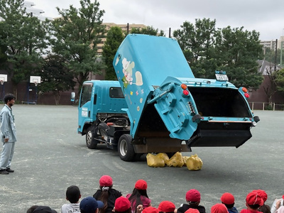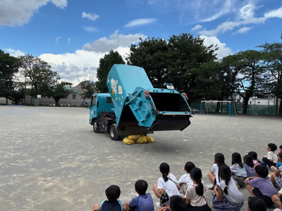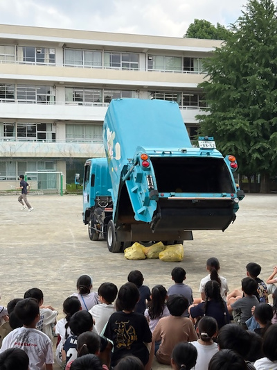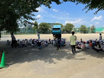ごみ収集車を校庭に入れさせて頂き、収集作業の見学や記念撮影等喜んで頂けた様子でした。