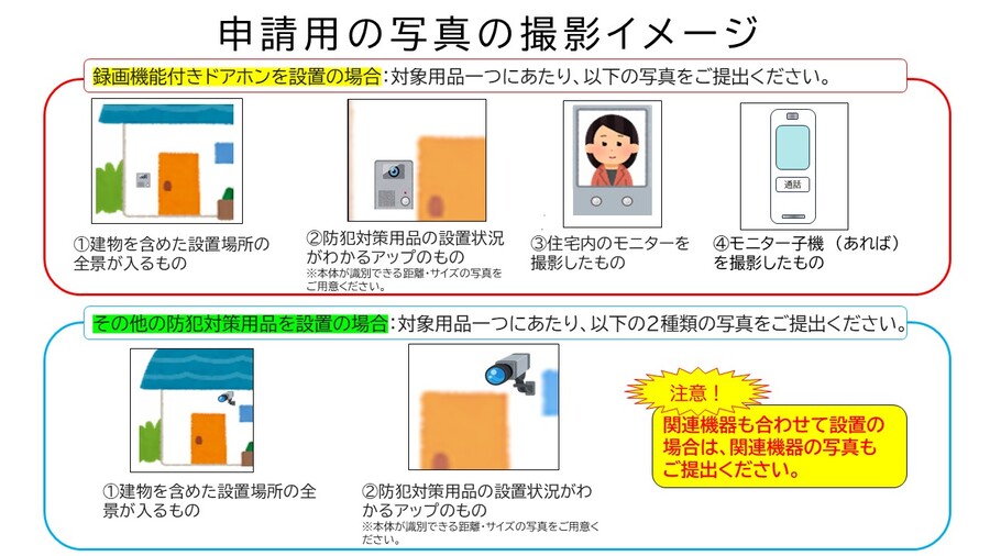 防犯対策用品設置工事や購入物の内容が記載された書類、図面、工事前の写真 |