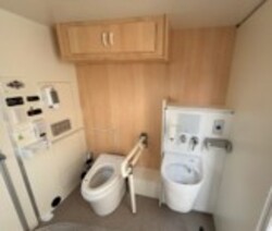5室のうち1室は多機能トイレとなっており、電動車いすリフター、オストメイト対応設備、オムツ交換台、ベビーキープも備えた個室です。