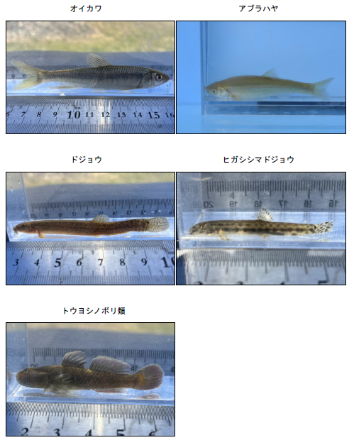 夏季調査、冬季調査合わせて、アブラハヤ、ドジョウ、トウヨシノボリ類等の2目3科5種の魚類が確認された。