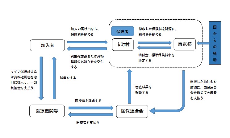 国民健康保険は、みなさんが住んでいる都道府県と市町村が、ともに保険者となって運営しています。保険者である各市町村は、加入者のみなさんが納める保険料や、国や東京都からの補助金などを財源として、医療費の支払い(保険給付)などの業務を行っています。