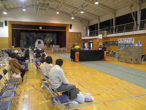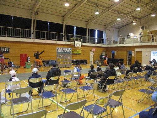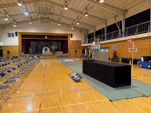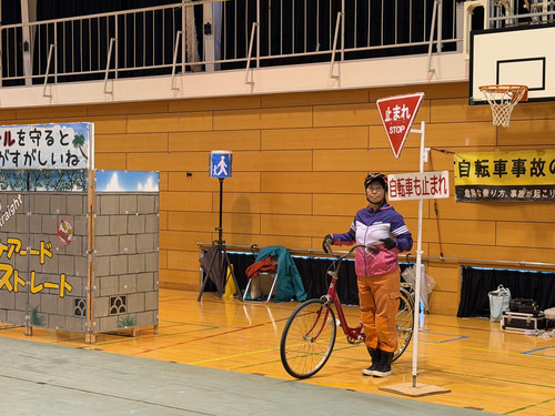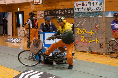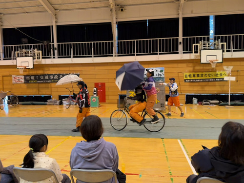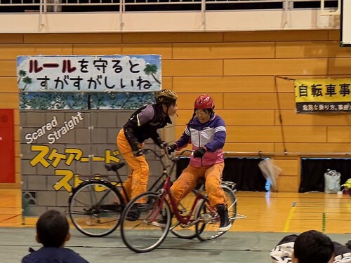 交通安全教室内で実施したスケアード・ストレイトは、スタントマンによる交通事故再現を通じて、自転車の危険性を再認識いただき、事故の衝撃、恐ろしさを視覚的に経験することで交通ルール・マナーの大切さを学んでいただくものです。天候はあいにくの雨天となりましたが、体育館で開催しました。