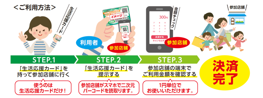 (1)生活応援カードは、参加店舗でのお買い物やお食事等のお支払いにご利用いただけます。